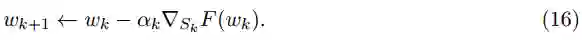 在每一次迭代中,随机梯度法都会计算梯度 F(Wk)的无偏估计 GK。该估计可以以及低的代价计算得到;例如,对于公式(12),某次迭代的随机梯度可被求解为