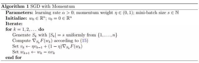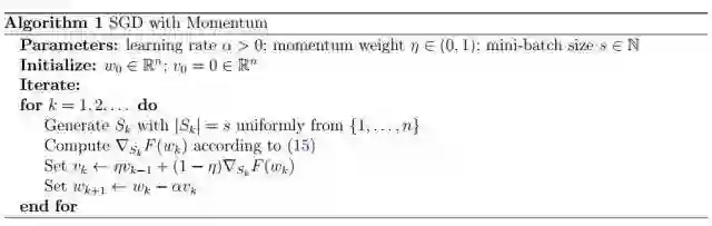 然而,在实际运用中,标准的 SGD 并不一定是解决机器学习中优化问题的最有效方法。事实上,机器学习和优化算法领域在开发改进或替代 SGD 方面进行了大量的积极研究。在随后的两部分中,我们将讨论两类方法:方差缩减法和二阶方法。但是在这两类方法以外,还有多种方法。例如,加有动量的 SGD 就是一个实践中被发现的性能好于好于标准 SGD 的拓展版 SGD。见下图算法 1