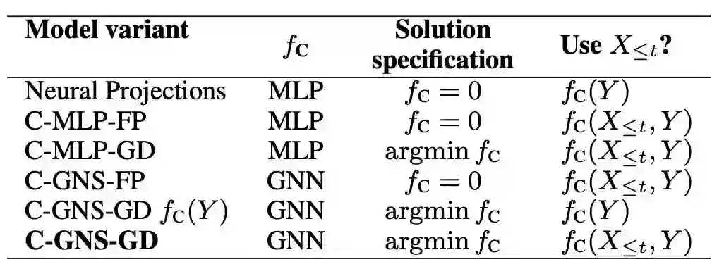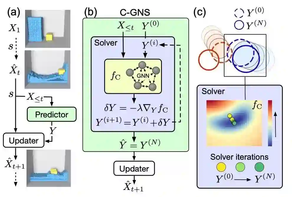 对于一个描述物理过程的动态场景,点的信息通常依附于时间,如 ,对于一个物理系统,这个模拟器应当回顾所有历史信息,即$X_{<t}$,记作$\hat{x}_{t+1}=s\left(x_{\leq t}\right)$。虽然在通常情况下我们会考虑马尔科夫链认为一个序列中当前时刻仅受到上一时刻影响,但在物理场景下只靠一个时刻是不能包含这个系统的其他信息的,比如加速度。从显式的角度来看,节点可以确定一个函数,如:节点的前序时间上的位置可以确定新的速度信息,写作$\hat{y}="f_{\mathrm{D}}\left(X_{\leq" t}\right)$。这里的$f_{\mathrm{d}}$就是取一个gnn的前向,这个gnn的边信息表示了两个物体之间是否存在相互作用。在这一系列的物理模拟场景中,这个gnn的选择通常为graph="" network="" block,即gn="" block。系统中的约束主要由$x$本身和反应出的系统趋势$y$共同构成,写作$c="f_{\mathrm{C}}\left(X_{\leq" t},="" y\right)$,$f_{\mathrm{c}}$是一个可训练的网络,并且输出为正数。约束条件首先直接影响y的更新,图(b)中的紫色方框中描述了$y$的第$i$次更新,迭代式写作:<="" p="">