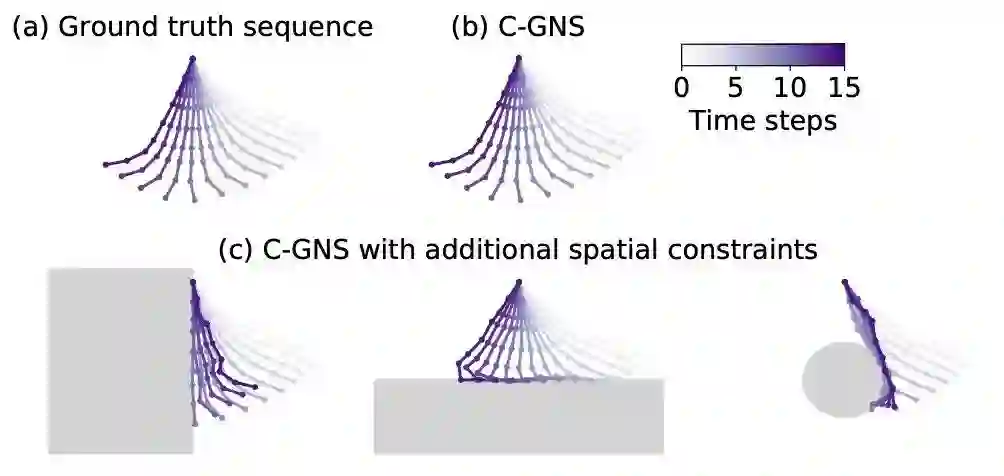 假设用保龄球冲击瓶子,用一种物理的方法解释这个现象,可以构造出两个约束,一个是保龄球和瓶子在空间上不能占据同一位置,另一个是整体的能量与动量必须守恒。这是一种显式的约束条件,能够在整个系统中的局部环境下产生作用。现有方法似乎不太重视这样的约束,因此会导致模拟不出来真实情况。因此,作者提出了带有约束的图网络模拟器,C-GNS来解决这种更复杂的场景。模型整体设计如图所示:其中,(a)展示了模型描述的物理过程,在一个物理过程中用