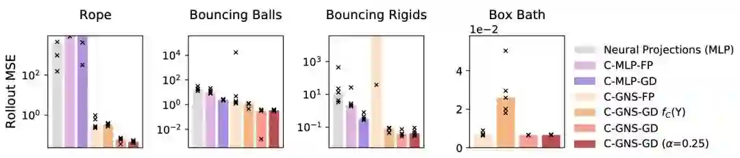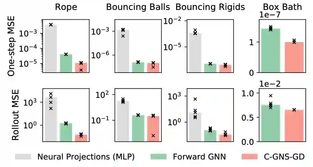 表示整个系统的趋势,比较抽象,在不同场景里可以扮演不同角色,比如速度,加速度,可以看做节点的额外特征。因此,一个时间节点下的模拟器应当是利用当前节点信息预测当前系统的趋势。(b)细化了这个模拟器本身的具体流程,传入t之前时刻的节点信息和初始的系统状态,加入一个GNN约束的方程,即可更新整个系统的信息,之后再用系统的信息更新节点信息。(c)中假设了一个简单场景,如果两个小球碰撞,约束器会如何优化