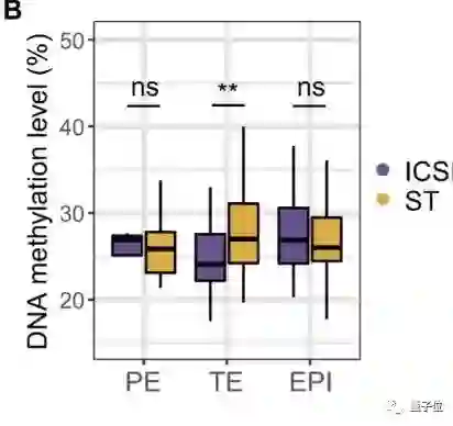 具体到三个胚层中,有两个没有显著差异,但其中一个胚层甲基化水平略高2.4%,研究者认为,这是因为在胚胎着床前发育中,ST囊胚分化略有延迟导致DNA甲基化略高,属于正常现象。