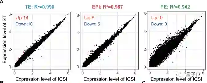 从下图能看出,横轴为对照组纵轴为ST组,回归分析表明,在三个胚层中,两组相关系数均在0.94以上。尤其PE胚层,差异表达基因 (DEG)为零。