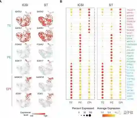从下图结果能看出,ST组和对照组(ICSI)在t-SNE图中紧密聚集,这表明ST胚胎在分化中基本正常。