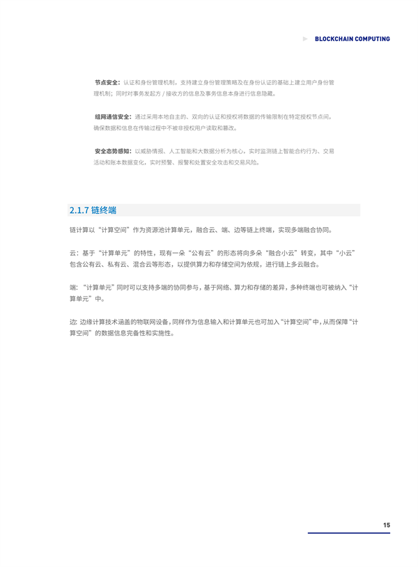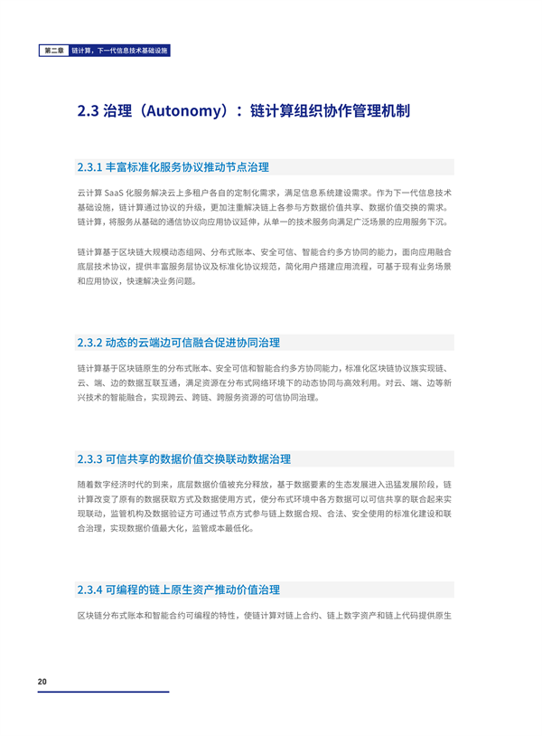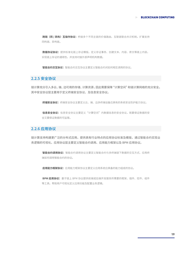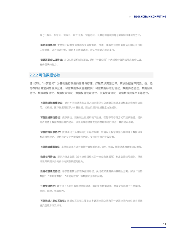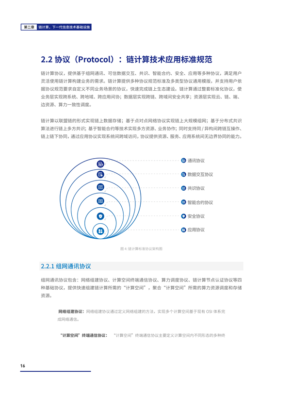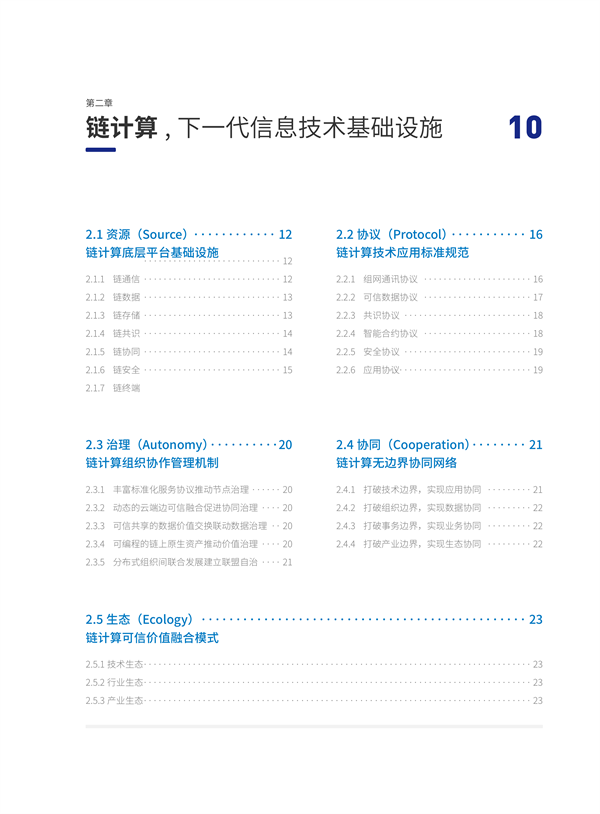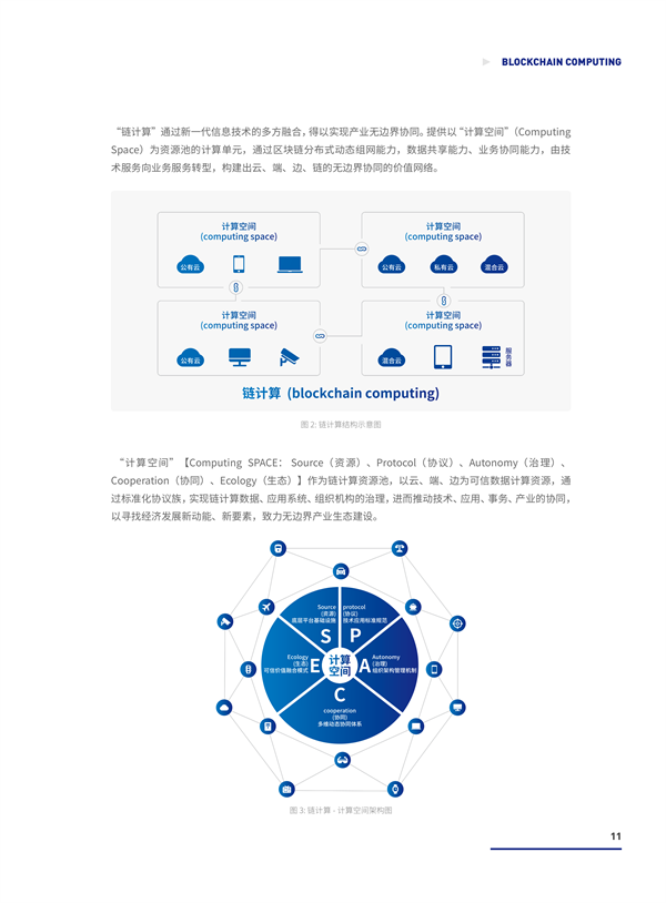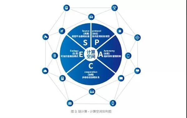链计算:以“计算空间”(Computing Space)为资源池的计算单元,该计算单元具备 Source(资源)、Protocol(协议)、Autonomy(治理)、Cooperation(协同)、Ecology(生态)五种可弹性扩展能力,并通过标准化协议族,实现链计算数据、应用系统、组织机构的治理,进而推动技术、应用、事务、产业的协同。通过区块链分布式动态组网能力,数据共享能力、业务协同能力,由技术服务向业务服务转型,构建出云、端、边、链的无边界协同的价值网络。