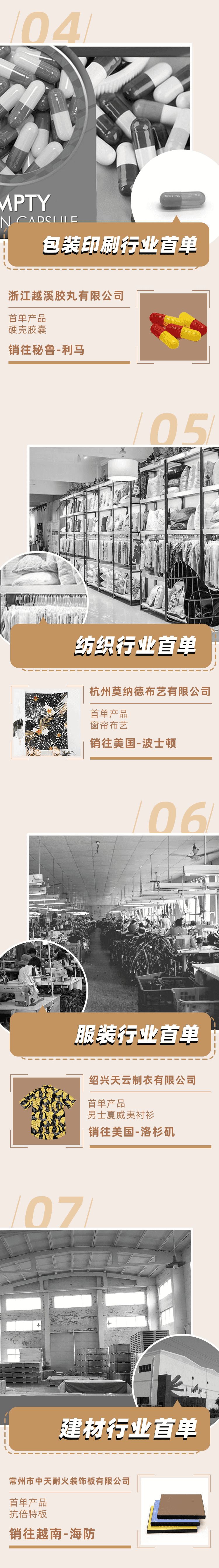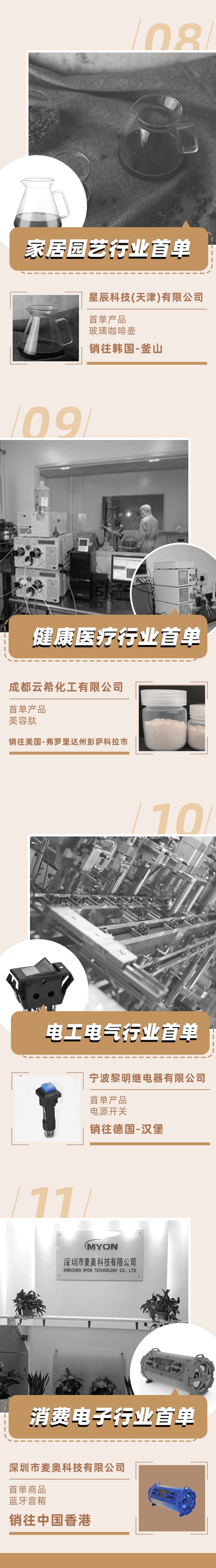 以采购节对外官宣的各行业首单为例,有销往英国萨默赛特郡的机械行业、销往英国特伦特河畔斯托克的美容及个人护理行业、销往菲律宾马尼拉的汽摩配行业、销往秘鲁利马的包装印刷行业、销往美国波士顿的纺织行业、销往美国洛杉矶的服装行业、销往越南海防的建材行业、销往韩国釜山的家居园艺行业、销往美国佛罗里达州彭萨科拉市的健康医疗行业、销往德国汉堡的电工电气行业等等。