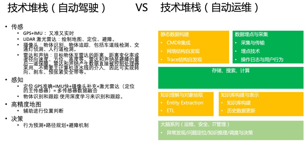 例如右半部分“自动运维技术堆栈”主要分为四个部分:动态数据采集层,能够从各个系统中获得运行数据,例如 Log,Metric 和 Tracing 等。可以认为是自动驾驶的摄像头、激光雷达等感知设备。静态数据采集层:将 IT 架构的型号、上下游依赖等进行构建,以确定上下文。类似自动驾驶的静态地图。处理层(包括数据存储、搜索、计算等工作):把采集到的数据运行各种规则,以形成可以被分析的数据。类似自动驾驶中对其他车辆、人、交通信号等进行建模,以判断对应的速度、区域、方向等。决策层:最重要的部分,根据计算后的数据对关联的对象行为进行预测、分析、推理等,以确定风险和下一步的行为,类似自动驾驶中的大脑。