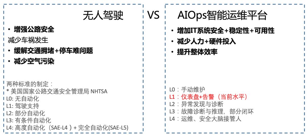 同时我们可以把自动驾驶与 AIOps 整个技术体系做一个类比,也是类似的效果。为了达到 L4 终极目标,有如下横向工作需要建立: