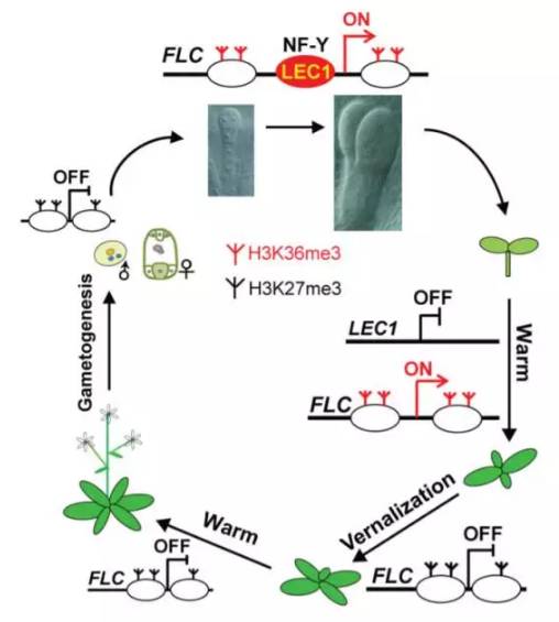 表观遗传学上的修饰在动物和植物的基因表达调控上有着重要作用,关键基因上表观遗传印记的传递也对细胞命运的保持有着重要意义。然而,在生长发育过程中于这些调控位点上积累的印记必须在胚胎里被去除,这样才能确保后代的发育正常。在拟南芥中,长期暴露在低温下的春化过程能沉默“成花抑制基因”FLC,从而让植物能在春暖花开之际,盛放自己的花朵。理论上说,开花后结成的种子里,FLC基因也应当处于沉默状态。然而,为何每一代植物中的FLC基因都需要重新通过春化沉默一遍呢?植物学家对背后的机制产生了好奇。中国科学院上海生命科学研究院的何跃辉博士课题组与新加坡国立大学的俞皓教授合作,发现种子特异的转录因子LEC1能让FLC基因所在的染色体区段“活化”,让FLC基因得到表达,这种表达会让合子中已发生的“沉默”失效,这就是为何每一代植物都需要重新对FLC基因进行沉默。这项研究揭露了植物胚胎染色体重编程的机制,也提供了关于表观遗传学记忆的新洞见。