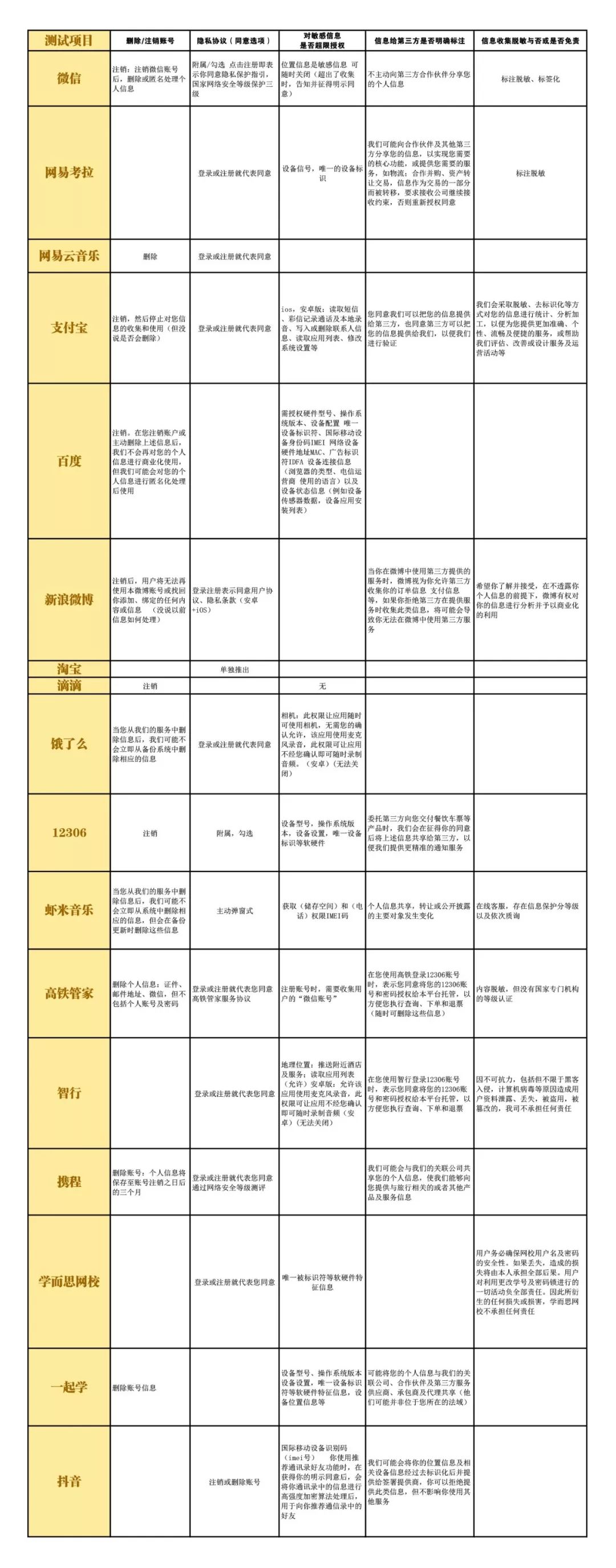 3·15期间,《IT时报》记者对百度、支付宝、微信、微博、抖音短视频、滴滴出行、饿了么、携程,铁路12306、智行火车票-12306高铁抢票、网易云音乐、虾米音乐、学而思网校、淘宝等近20家常用手机App的个人隐私协议进行了调查。(文末附APP权限调查结果)