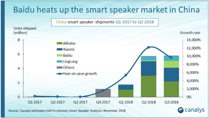 效果也十分显著。Canalys报告显示,百度智能音箱第三季度环比增速高达711%,以同比计算,可能提高百倍以上,是所有厂商中增长最快的一家。100万台的出货量也跻身中国市场前三名。