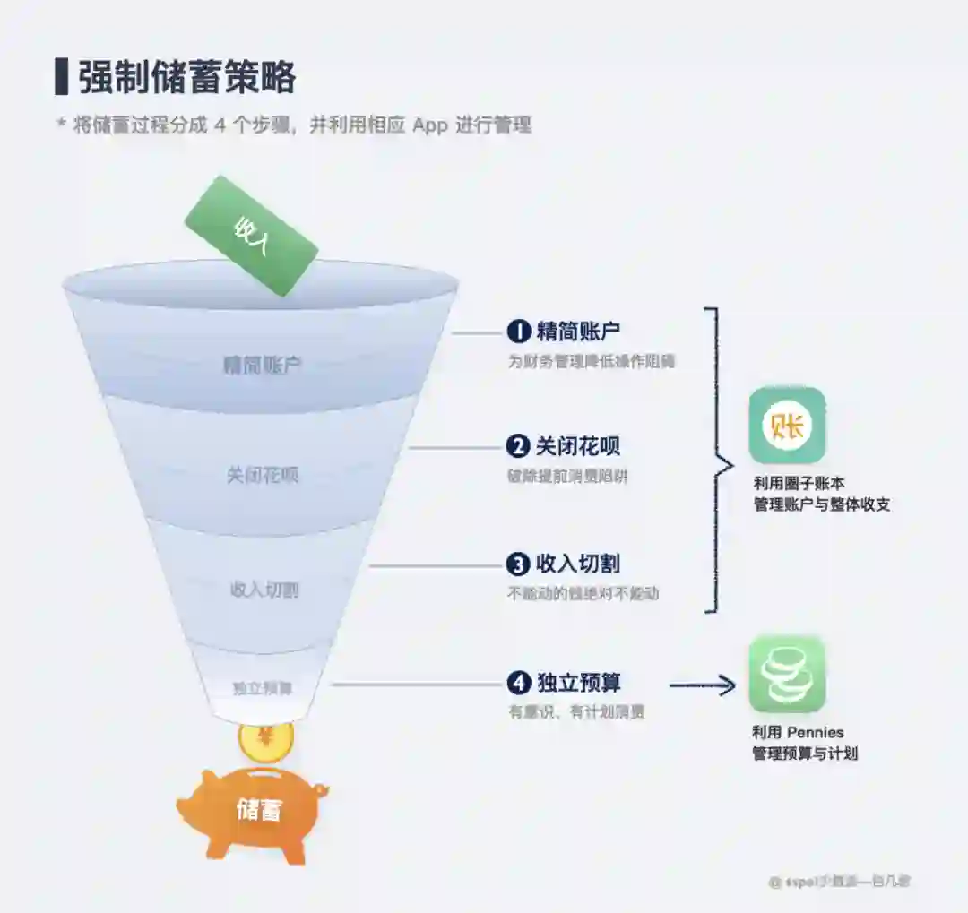 所以在当前这个阶段,在如何与金钱相处的这件事上,自己又回到如何强制储蓄,如何积累本金的问题上。目前以个人经验,将整个储蓄过程分成 4 个步骤,每一个步骤都旨在缩小财富的出水口。