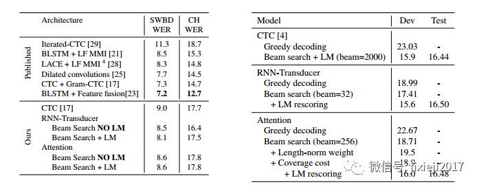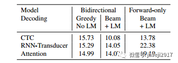 在本节中,我们对模型的性能进行了比较。涉及到公开基准以及我们自己的内部数据集。ASR的端到端模型的承诺是简化语言训练与推理管道系统。端到端CTC模型只简化了训练过程,但推理仍然涉及大规模解码。