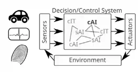 图 1:人工智能系统已经成为各种应用中决策和控制系统的一部分,例如自动驾驶汽车、医疗保健和生物识别技术。Connectionist AI(cAI,例如神经网络)、符号 AI(sAI,例如决策树)和经典 IT (cIT) 模块通过传感器和执行器相互交互并与环境交互,从而导致整体系统行为。在这里,我们只关注单个 cAI 模块(粗体字)。