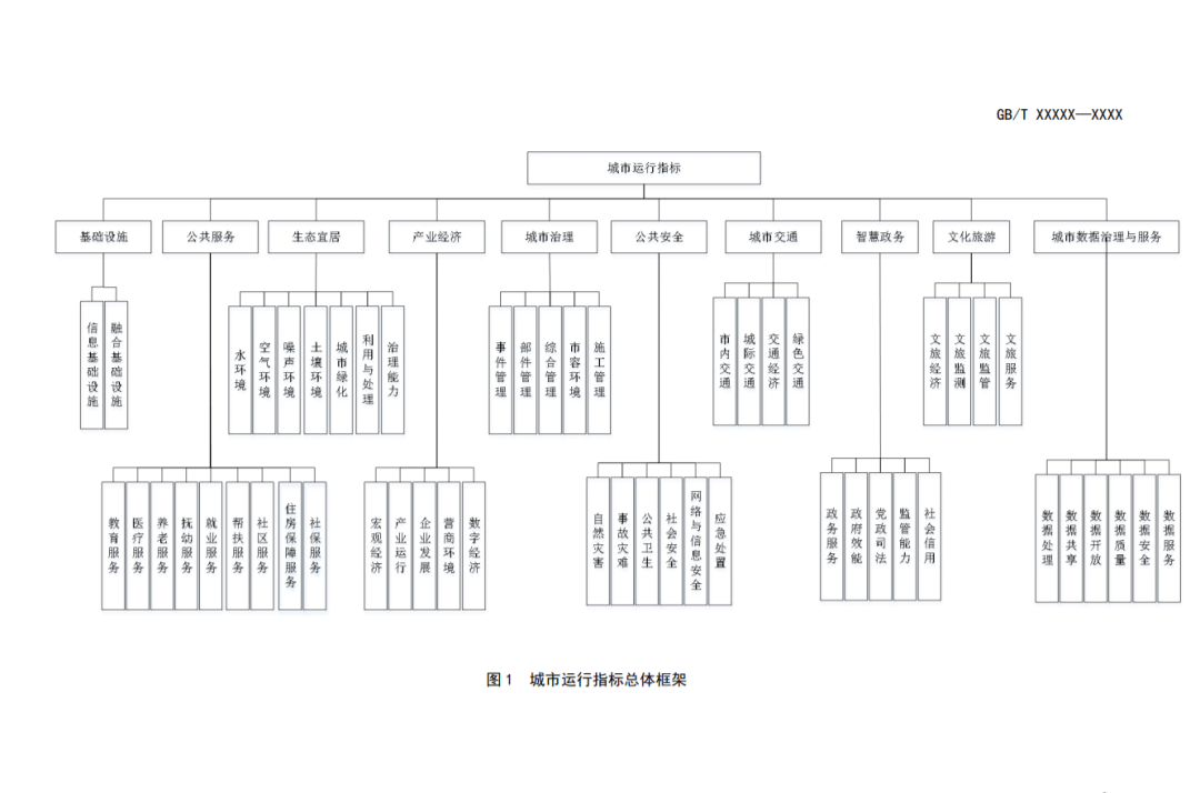 城市运行指标总体框架共包含10个一级指标分类、53个二级指标分类。每个二级指标分类下设多个指标项。如图所示: