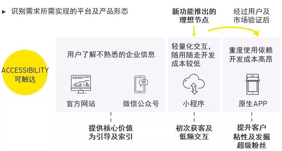 当企业得到需求的必要性之后,我们需要进一步看产品的功能要在何种渠道上呈现,才能够更好地让用户使用。其中,安永结合当前企业针对消费交互的主要平台,尤其是微信生态的平台体系,进行了系统的数字化产品发展规律梳理总结。总结针对用户“前期知晓——轻度接触——重度使用”三个不同阶段的需求筛选功能需求,需要以网页、小程序或者原生程序的产品形态在不同渠道呈现。