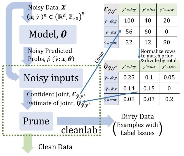 置信学习开源工具cleanlab操作起来比较容易,但置信学习背后也是有着充分的理论支持的。事实上,一个完整的置信学习框架,需要完成以下三个步骤(如图1所示):
