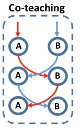 如图6所示,Co-teaching的基本假设是认为noisy label的loss要比clean label的要大,于是它并行地训练了两个神经网络A和B,在每一个Mini-batch训练的过程中,每一个神经网络把它认为loss比较小的样本,送给它其另外一个网络,这样不断进行迭代训练。