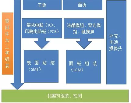 目前,3C制造业包括前段零部件加工、中段模块封装、后段整机组装三大环节。以手机生产为例,前段环节包括集成电路(IC)、印刷电路板(PCB)、液晶模组、背光模组、触摸屏、外壳、电池、摄像头等零部件制造,中段环节包括主板表面贴装(SMT)、面板组装(LCM),后段环节是指整机组装、检测等。