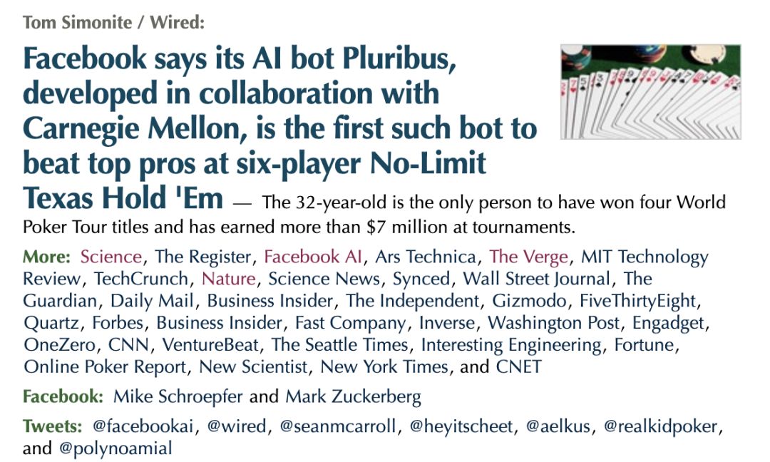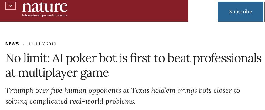 Brown, N. and Sandholm, T. 2019. Superhuman AI for multiplayer poker. (https://science.sciencemag.org/content/early/2019/07/10/science.aay2400) Science, July 11th.