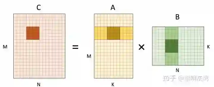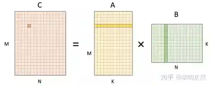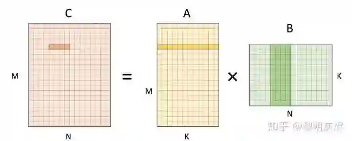 通用矩阵乘(下文简称 GEMM)的一般形式是 𝐶=𝐴𝐵C=AB, 其中 𝐴A 和 𝐵B 涵盖了各自转置的含义。图一是矩阵乘计算中为计算一个输出点所要使用的输入数据。三个矩阵的形状也如图所示。