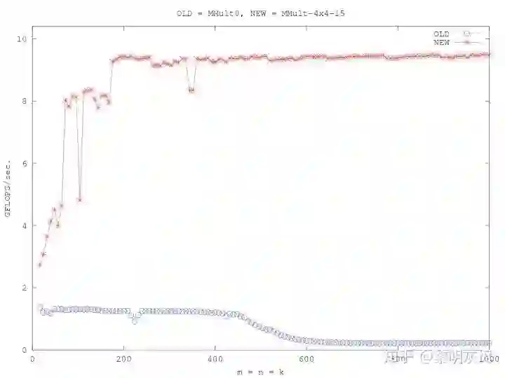 How to optimize gemm (https://github.com/flame/how-to-optimize-gemm/wiki)介绍了如何采用各种优化方法,将最基础的计算改进了约七倍(如图二)。其基本方法是将输出划分为若干个 4×4子块,以提高对输入数据的重用。同时大量使用寄存器,减少访存;向量化访存和计算;消除指针计算;重新组织内存以地址连续等。详细的可以参考原文。