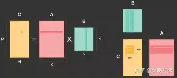 在常规的数据规模中,由于左侧会发生太多的高速缓存缺失,又由于矩阵乘这样的计算对数据的访问具有很高的重复性,将它重排成右侧的内存布局减少高速缓存缺失,可显著地改进性能。另一方面,矩阵乘中两个输入矩阵往往有一个是固定的参数,在多次计算中保持不变。那么可以在计算开始前将其组织成特定的形状,这种优化甚至可以将性能提高 2x。