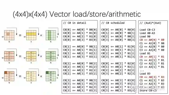 图六右侧列出了三份伪代码。第一份 C0 in detail 是计算 C0 中四个输出元素的朴素方法的展开,连续四次计算得到一个 C0 元素的结果。将计算过程稍作重排,即可得到 C0 scheduled 展示的计算,这里连续的四次计算分别处理了 C0 中四个元素的 1/4 结果。在连续的四次计算中,重排前只有对 𝐴A 的访存是连续的,重排后 𝐵 和 𝐶 的访存都是连续的。那么向量化这些访存和计算,即可得到第三列伪代码中红色 C0 部分。而第三列是通过对 C1、C2、C3 进行类似的处理得到的。