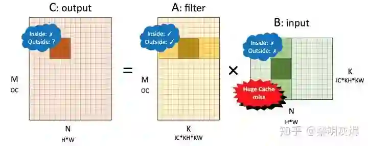 im2col 计算卷积使用 GEMM 的代价是额外的内存开销,输入会使用额外的 𝐾𝐻×𝐾𝑊 倍内存。当卷积核尺寸是 1×1 时,由于不需要重排输入,GEMM 可以直接在原始输入上运行,并且不需要使用额外的内存。