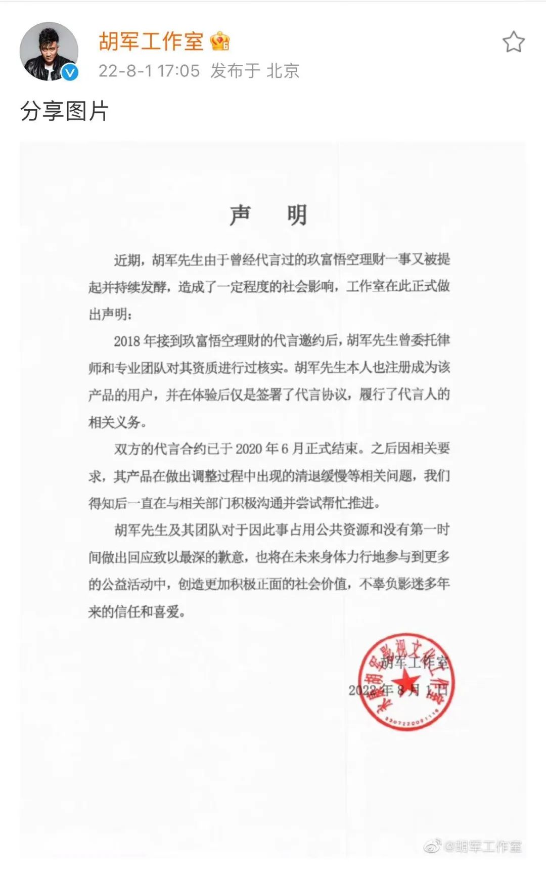 胡军工作室官方微博回应称,2018年接到玖富悟空理财的代言邀约后,胡军曾委托律师和专业团队对其资质进行过核实。胡军本人也注册成为该产品的用户,并在体验后仅签署了代言协议,履行了代言人的相关义务。(中新经纬)