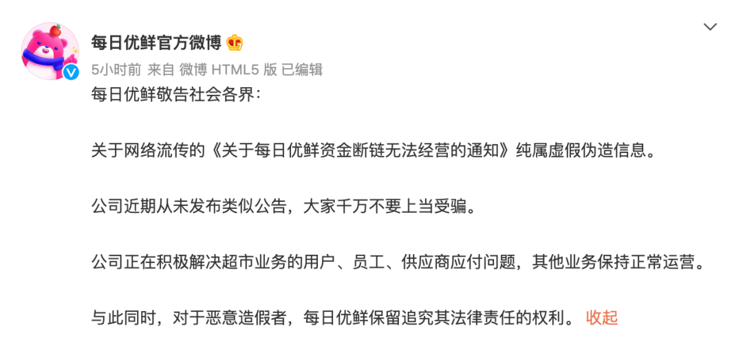 【每日优鲜否认“资金断链”:虚假消息,不要上当】