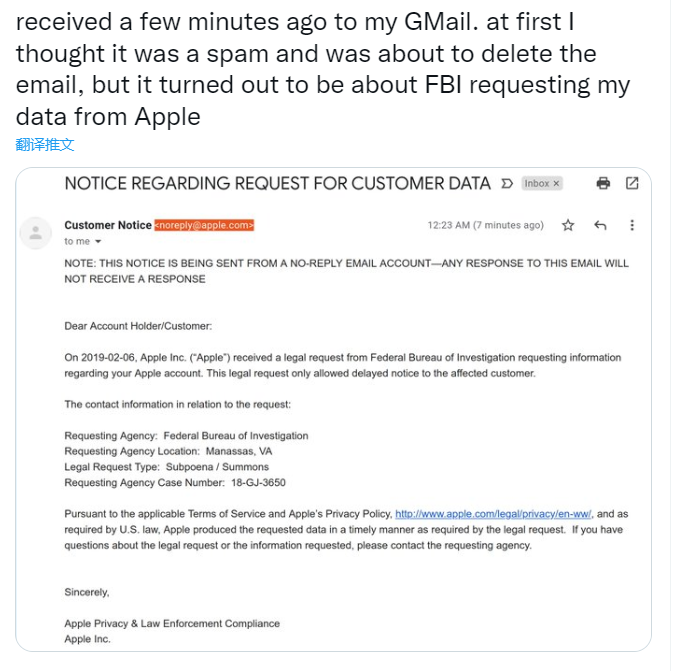 去年5月,Elbakyan在推特上表示收到一封来自苹果的通知邮件,被告知美国联邦调查局(FBI)在2年多前就已要求苹果提供其个人账户数据供调查,并且苹果已按要求执行了FBI的命令。