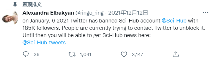 受到印度诉讼案的影响,2021年1月,推特官方宣布永久封禁Sci-Hub账号,理由是「违反平台有关假冒产品的政策」。被封禁时,该账号粉丝数量超过18.5万。