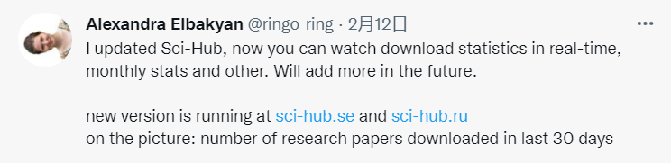 最近,Sci-Hub创始人Alexandra Elbakyan发布推文称自己更新了Sci-Hub,用户现在可以查看实时下载数据、月度下载数据等等。