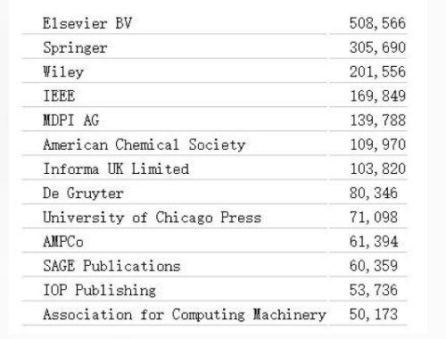 有人统计了一下,去年9月那次「十周年活动」更新的大部分论文来自于世界最主要的几家期刊出版商 :Elsevier 508566 篇 ;Springer 305690 篇 ,Wiley 201556 篇 ,IEEE 169849 篇, ACS 109970篇。