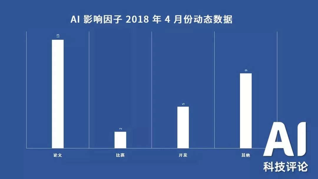 根据「AI 影响因子」数据库显示,2018 年 4 月份国内企业研究院发布论文 13 篇,比赛获得冠军事件 2 起,开发类事件 5 起,其他 AI 领域影响事件(成立实验室、人事变动、独家专访等) 9 起。