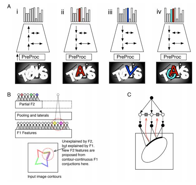 上图(A)中的 i 为前向传播(包括了侧面传播),生成多个字母的假设展示在输入图像中。PreProc 是一组类 Gabor 的滤波器,可以将像素转化为边缘似然度。ii 为后向传播和侧面传播(lateral propagation)创建的分割掩码,它可用来挑选前向传播的假设,上图掩码为「A」。iii 是错误的假设「V」正好拟合「A」和「K」的交叉点,错误的假设需要通过解析来解决。(iv)可以激活多个假设以产生联合解释来避免字母遮挡情况。(B)第二级特征上学习各种特征。彩色的圆圈表示特征激活,虚线圆圈表示提出的特征。(C)从轮廓领域学习边缘(laterals)。