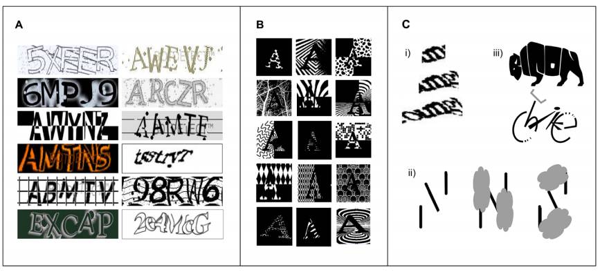 图 1:人类在字母形式感知上的灵活性。(A)人类擅长解析不熟悉的验证码。(B)相同的字母可以有非常多的表现形式,上图都是「A」。(C)对形状的感知可以有助于将其解析为相近的目标。