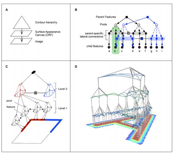 上图(A)层级结构生成对象的轮廓,条件随机场(CRF)生成表面外观。(B)轮廓层级相同的两个子网络通过复制特定父结点的子结点特征并连接它们到该父结点的旁边分支(laterals)而保持独立的分支连接。图中绿色矩形的结点是特征「e」的复制。(C)表征正方形轮廓的三级 RCN,第二级特征表征着四个角,而每个角都使用四个线段的连接表示。(D)表征字母「A」的四级网络。