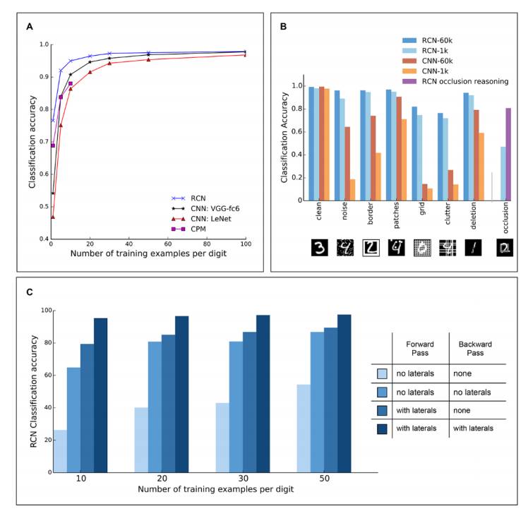 上图(A)为 RCN、CNN 和 CPM 的 MNIST 分类准确度。(B)为有损 MNIST 测试集上的分类准确度,图例展示了训练样本的总数。(C)为不同 RCN 配置的的 MNIST 分类准确度。