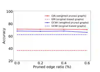 可迁移性 由于提出的模型可以提取与图神经网络无关的子图, 因此学习边权重可用于纯化原始的有偏图。这些稀疏子图代表重要的语义信息, 可以通用地转移到任何图神经网络。为了验证这一点,通过 学习边掩码, 并修剪最小的{0%, 20%, 40%, 60%} 权重的边缘, 同时保留剩余的边权重。然后在这些加权的修剪后数的据集上训练原始GIN和GCNII。图6是结果的比较,其中虚线表示基础模型在原始偏差图上的结果, 实线表示图神经网络在加权修剪后数据集上的性能。结果表明,在修剪后的数据集上训练的图神经网络取得了更好的性能,表明学习到的边掩码具有相当好的可迁移性。