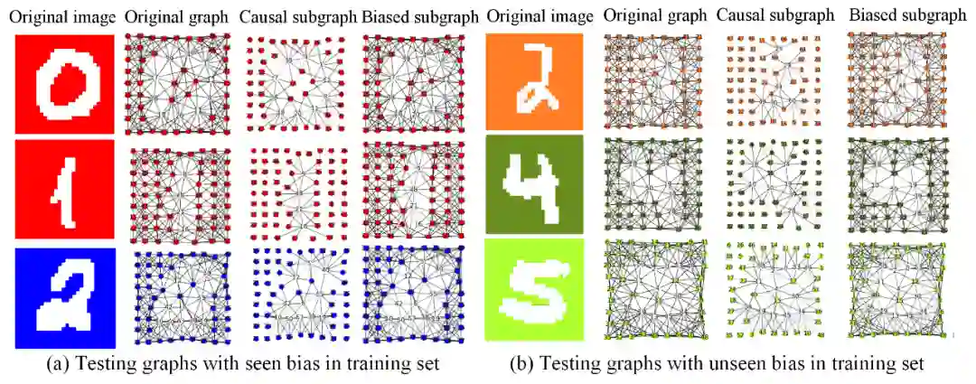 边掩码可视化 为了更好地说明 提取了显着因果子图和偏差子图, 将CMNIST-75sp数据集的原始图像, 原始图以及对应的因果子图和偏差子图在图4可视化, 其中边的宽度表示学习权重 或者 的值。图4(a)显示了在训练集中见过的偏差(颜色)的测试图的可视化结果。正如所看到的, 提出的模型可以发现数字子图中最显着边的因果子图。通过这些突出数字结构信息的因果子图, 图神经网络将更容易地提取这些因果信息。图4(b)显示了具有未见偏差的测试图的可视化结果。根据可视化, 提出的模型仍然可以发现因果子图轮廓, 这表明提出的模型可以识别因果子图, 无论偏差是可见还是不可见。