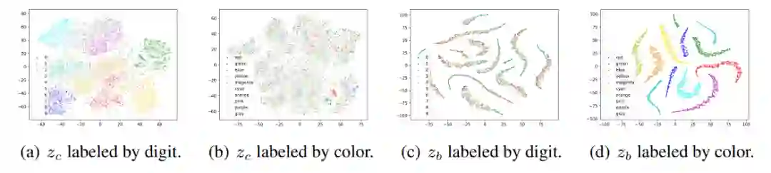 解耦可视化 图5分别显示了 的因果图神经网络 和偏差图神经网络 提取的隐向量 和 的投影。图5(a-b) 分别是由目标标签(数字)和偏置标签(颜色)标记的 的投影。图5(c-d)分别是由目标标签和偏差标签标记的 的投影。观察到 是根据目标标签聚类的, 而 是根据偏差标签聚类的。 在偏置标签下是混乱的, 在目标标签下是混合的。结果表明, DisC成功地学习了解耦的因果和偏差表示。
