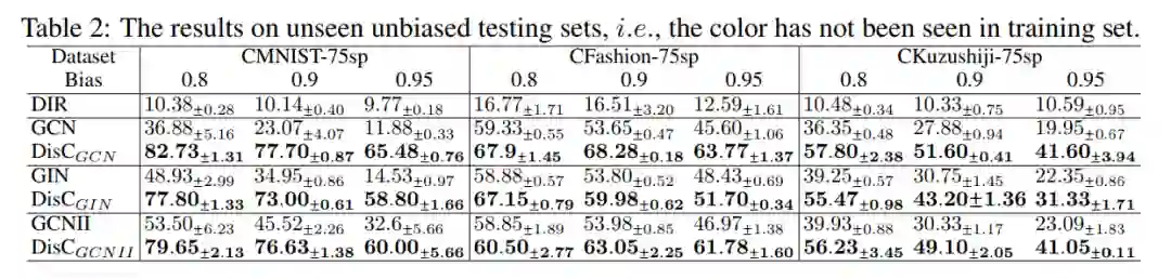 在未知偏差上的鲁棒性 表2报告了DisC与其对应的基础模型在不可见偏差测试集上的结果比较, 不可见偏差意思是训练集和测试集的预定义颜色(偏差)集是不相交的。与表1可见偏差场景的结果相比, 基础模型的性能进一步下降。然而, 提出的模型仍然取得了非常稳定的性能, 充分展示了提出的模型在不可知偏差场景下的泛化能力。