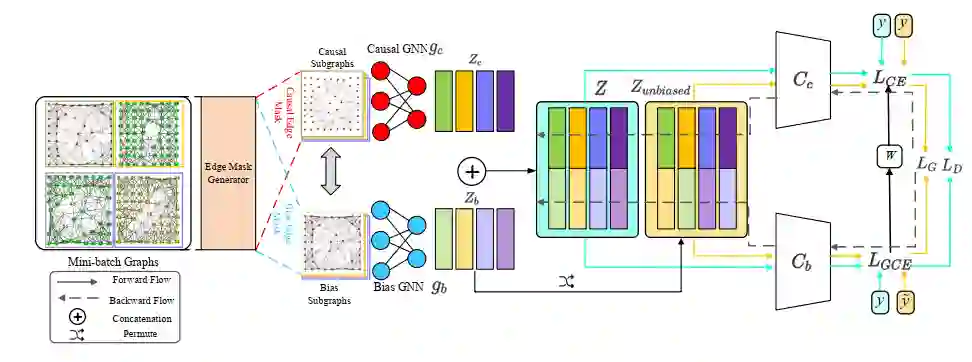 自然地,可以得到边 作为偏差子图中边的概率: 。现在可以构造因果边掩码 和偏差边掩码 。最后,将原始图 分解为因果子图 和偏差子图 。直观地说,边掩码可以突出原始图结构信息的不同部分, 因此建立在不同子图上的图神经网络可以对图信息的不同部分进行编码。此外, 掩码生成器有两个优点。(1) 全局视图: 在单个图级别,掩码生成器(MLP), 其参数由图中所有边共享, 对图中所有边进行全局视图, 这使得能够在图中识别社区。众所周知, 边的效应不能独立判断, 因为边通常会相互协作, 形成社区, 进行预测。因此,以全局视图中评估边至关重要。在整个图总体级别, 掩码生成器对训练集中的所有图进行全局视图, 这使得能够识别因果/偏差子图。特别地, 由于因果/偏差是总体水平的统计信息, 因此有必要查看所有图样本以识别因果/偏差子结构。考虑到这种联合效应和总体级别的统计信息, 生成器能够更准确地测量边的重要性。(2) 泛化性: 掩码生成器可以将掩码生成的机制推广到新的图而不需要重新训练, 因此它能够有效地修剪未知的图数据。