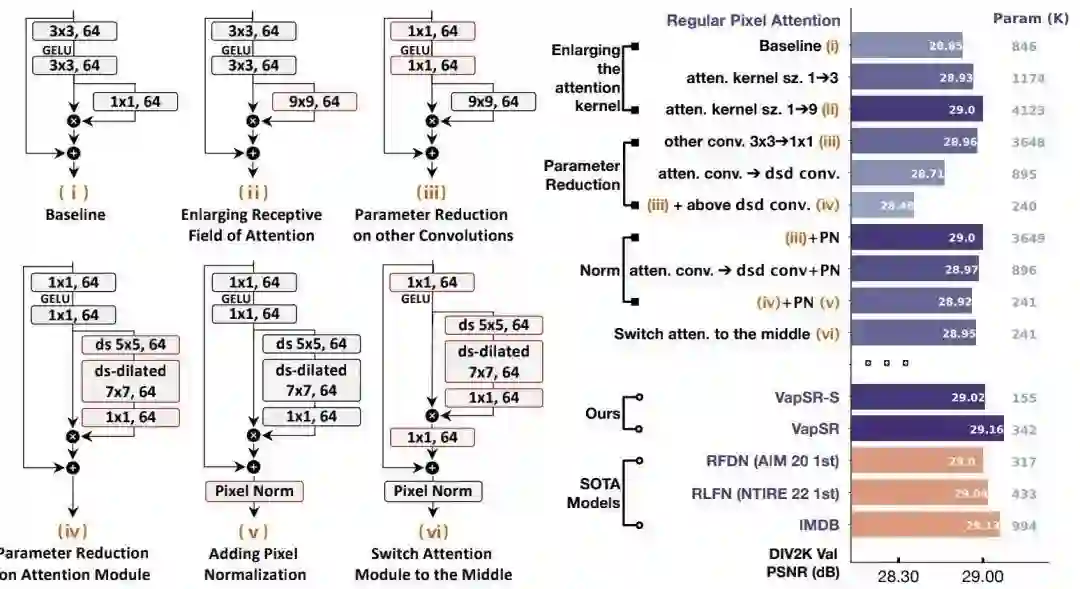 前面的探索主要聚焦在微观层面,基于此,作者进一步在宏观层面进行了更多设计与提炼,进而构建了VapSR,取得了更佳的性能,同时具有更少的参数量。