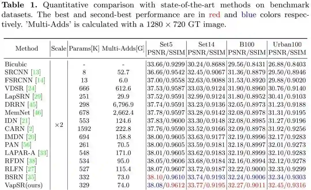 在实验部分,作者构建了VapSR与VapSR-S两个版本的轻量型超分方案: