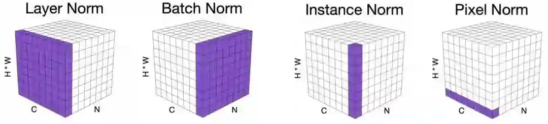 Pixel Normalization(PN) 注意力机制的元素乘操作会导致训练不稳定问题:小学习率收敛不够好,大学习率又会出现梯度异常。前面的注意力改进导致所得方案存在性能下降问题。为解决该问题,作者经深入分析后提出了像素规范化技术(可参考下图不同规范化技术的可视化对比)。