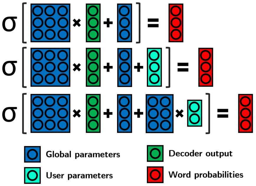在世界上,可以说每个人都会说或会写自己的母语,但受很多因素的影响,他们所倾向于谈论的内容大多是有关他们的性别、社会地位或地理来源。当试图执行机器翻译(Machine TranslationMT)的时候,这些变化对系统应该如何执行翻译有着重大影响,但是这并不能被标准的“一体适用”(one-size-fits-all)模型很好地捕捉到。在本文中,我们提出了一种简单且参数有效的自适应技术,它只需要直接或通过因式近似(factored approximation)来将输出softmax的偏差适应于MT系统的每个特定用户。用三种语言进行TED演讲的实验结果表明了翻译精确度的提高,并能够在目标文本中更好地反映演讲者的特征。