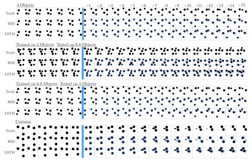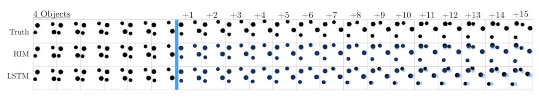 图 3:预测弹跳球的运动。给定前 15 个真值帧,系统预测接下来 15 个时间步。实验证明 RIM 的性能优于 LSTM(黑色是预测结果,蓝色是真值)。注意 LSTM 预测结果的重影。